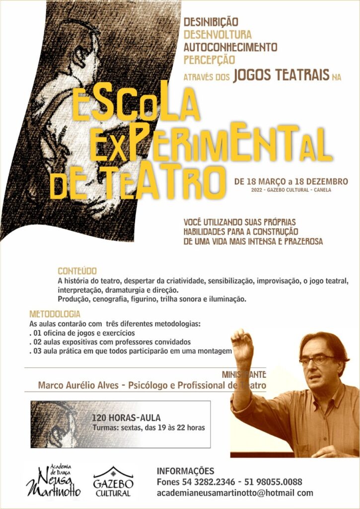 Última semana de inscrições para a Escola Experimental de Teatro que oferece o curso de teatro, com duração de 9 meses, todas as sextas feiras, das 19 às 22 horas, no Gazebo Cultural, em Canela.