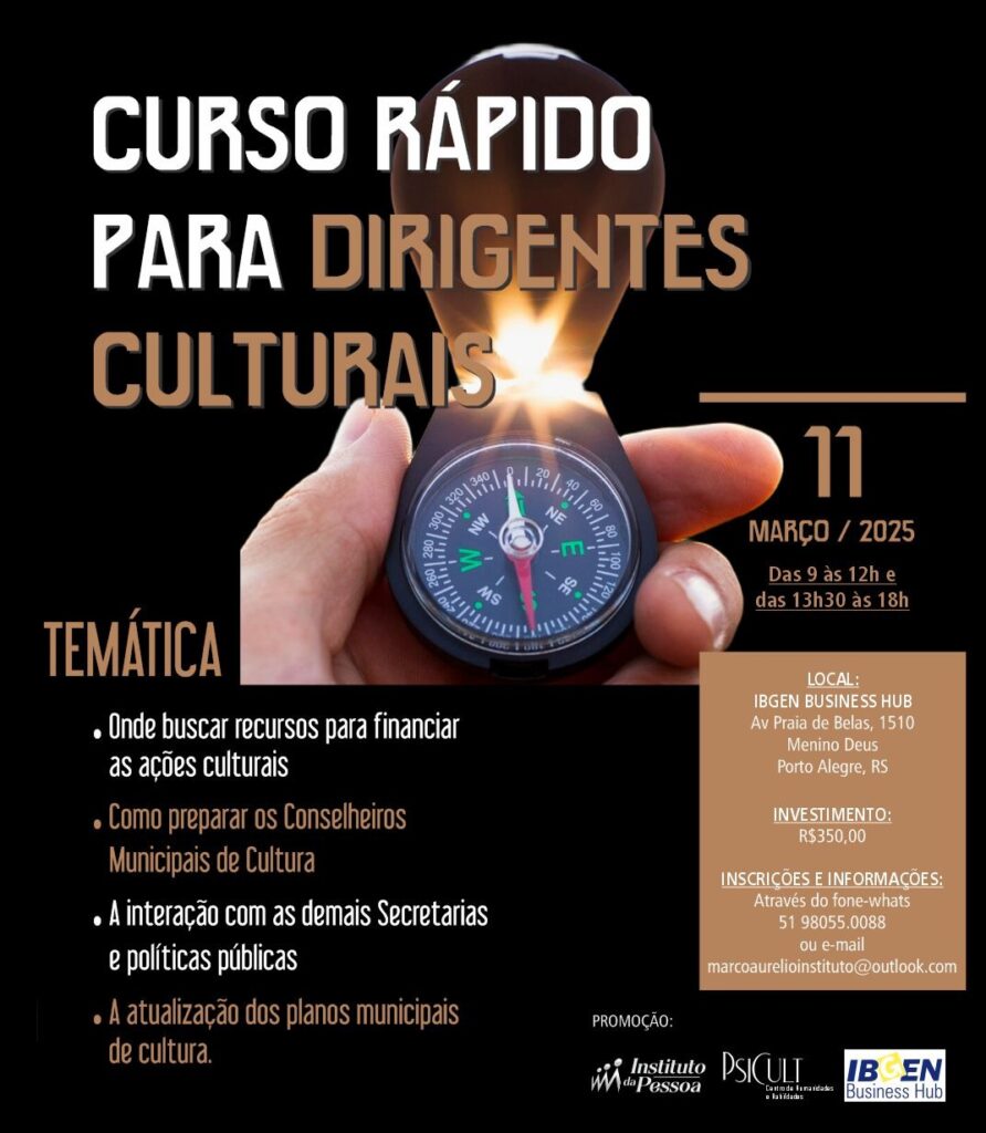 Vamos Realizar um curso rápido para Dirigentes Culturais – Porto Alegre 11 de Março de 2025 Venha abranger o seu conhecimento na área e ou ganhar os primeiros conhecimentos!