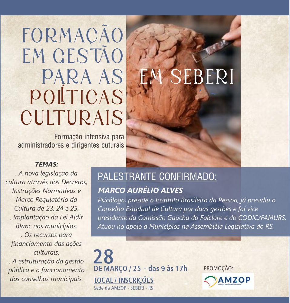 Vamos realizar a Formação em Gestão para Politicas Culturais em Sebeei RS, no dia 28 de Março de 2025, Venha garantir sua vaga