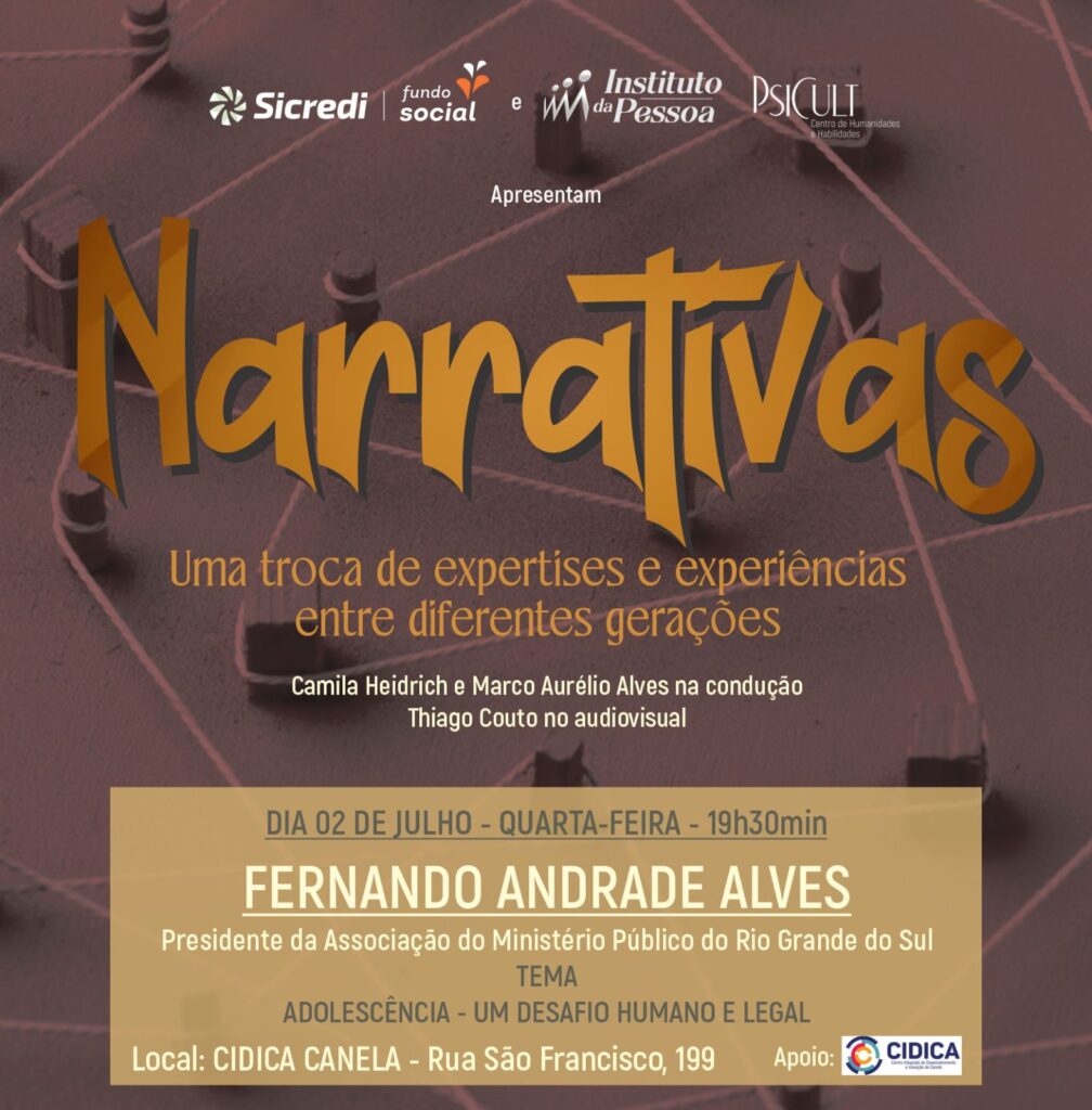 Lhe convido para prestigiar o evento Narrativas Uma troca de expertises e experiencias entre diferentes gerações – Dia 02 de Julho de 2025 as 19H30min – Cidica Canela Rua São Francisco 199