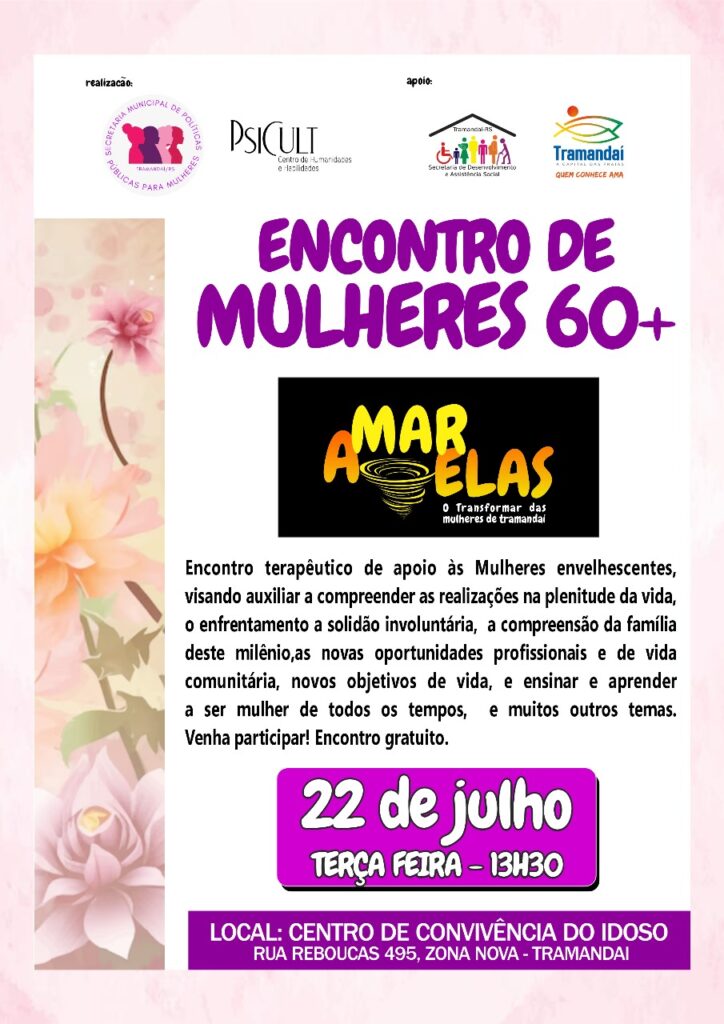 No dia 22 de julho, às 13h30, acontecerá o Encontro Terapêutico de Mulheres 60+, promovido pela Secretaria Municipal de Políticas Públicas para Mulheres de Tramandaí em parceria com o Centro de Humanidades e Realidades Psicult, com apoio da Prefeitura de Tramandaí e da Secretaria de Desenvolvimento e Assistência Social.