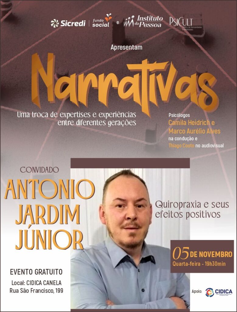 Narrativas #PsicultHumanidades #InstitutoDaPessoa #SicrediFundoSocial #CIDICA #SaúdeMental #Quiropraxia #BemEstar #Humanidades #CanelaRS #EventoGratuito